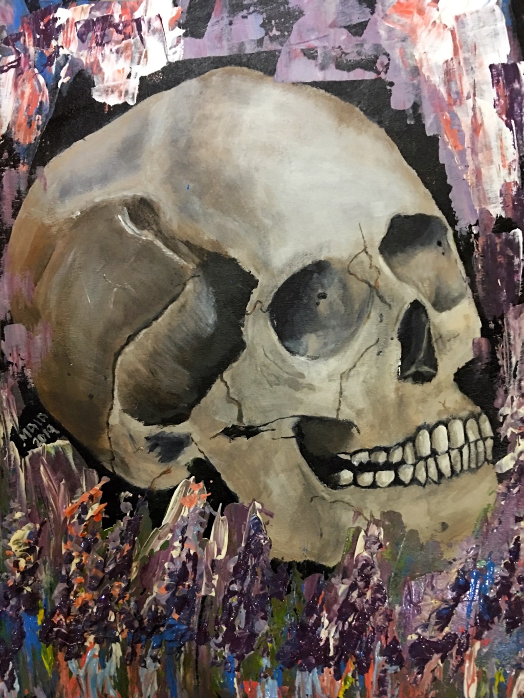 This painting has been nine months in the making. I started sketching it in November 2018. I’ve been holding off working on this painting because I thought it was daunting. It was my first time painting a realistic skull, and I am making it for a close friend, so I wanted it to be perfect.