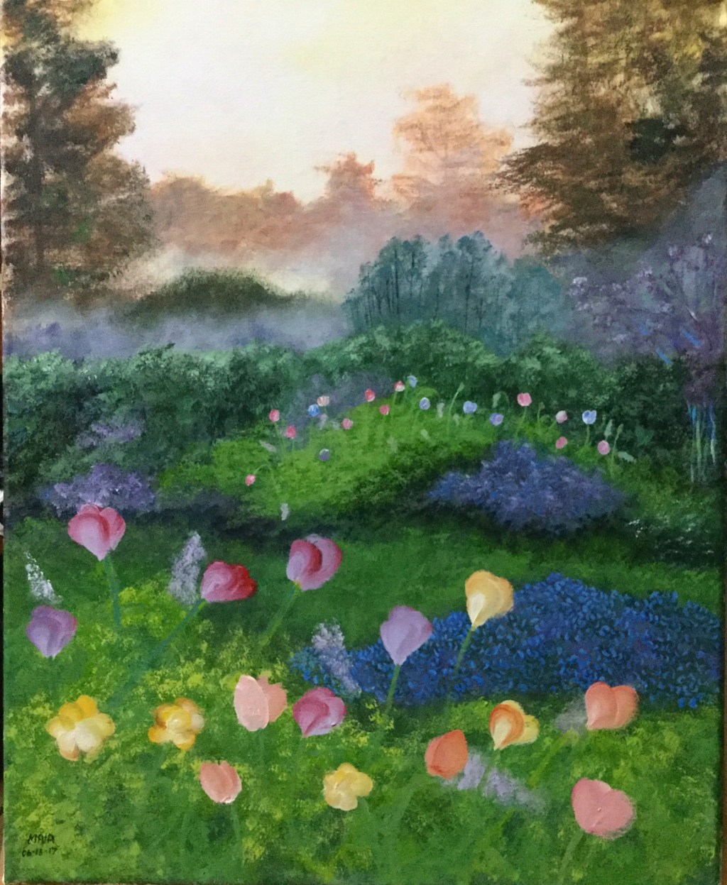 I was living in the city for two years when I painted Hardin. I terribly missed the country, the fog, and our garden. I missed looking out of my bedroom window and seeing Mt. Makiling and our garden’s flower beds instead of hard bricks and the roofs of stores and cafeterias nearby. I decided to create another window to the sceneries I’d rather be looking at. I’ve been the most calm while working on this garden painting, and it gave me solace and a window to the country when I was overwhelmed with the noise of the city.