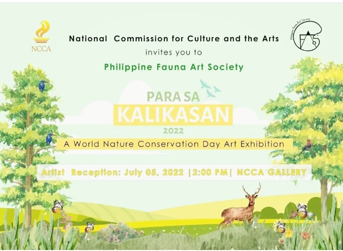 Please join us at the opening of the Philippine Fauna Art Society’s 7th art exhibition Para sa Kalikasan 2022 in celebration of the World Nature Conservation Day on July 5, 2022 at 2:00 PM at the National Commission for Culture and the Arts Open Gallery.