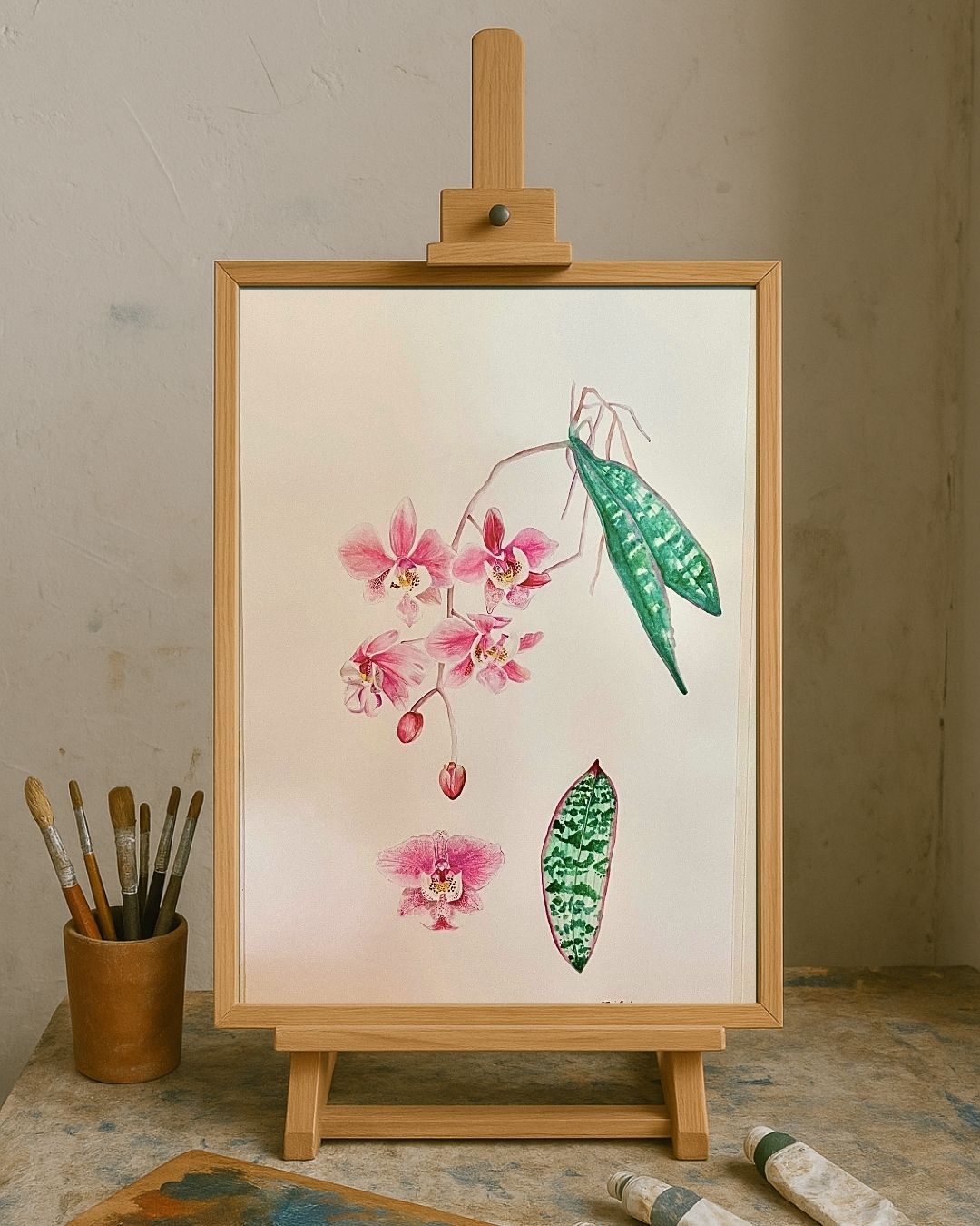 In my latest watercolor study, I set out to capture not only the ornamental appeal of P. schilleriana, but its biological identity. Every brushstroke was an invitation to observe: the arch of its inflorescence, the texture of its roots, the glimmer of mottled foliage—each a quiet testimony to the plant’s natural habitat and resilience. Painting it felt less like illustration and more like fieldwork with a brush.